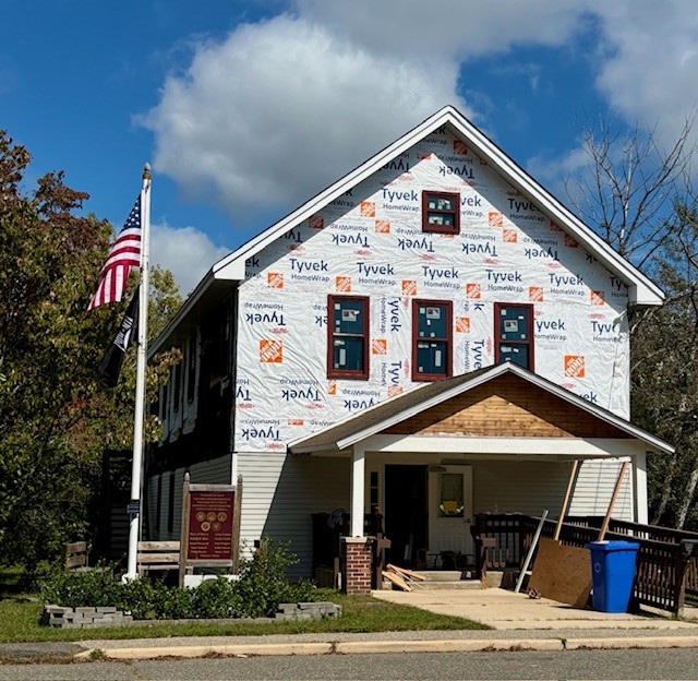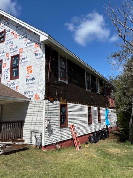 The remodeling of the 94 Stafford Ave building is moving along well this last week. The windows have now all been replaced and the lower level exterior clapboard siding has been repaired and primed, ready for final painting. The old cedar shake shingles on the upper story have all been removed and new tar paper installed in preparation for re-siding the building upper level with imitation vinyl cedar shake, dark red siding.
