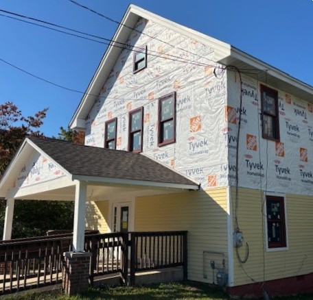 October 17th update: The windows have all been replaced and the lower half of the building has new cedar clapboard siding with a fresh yellow coat of paint and freshly painted white trim.