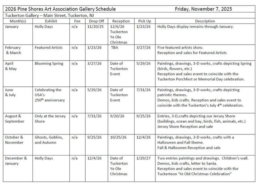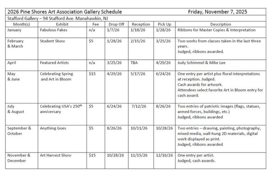 Here is the revised 2025 Gallery Schedule with adjustments for cancellation of the Art Harvest Show at Stafford and revised drop off and hang dates for the current Featured Artist and Holly Days Shows at Tuckerton.
