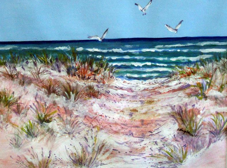 Above, left-to-right: watercolor paintings by Carol Neugebauer