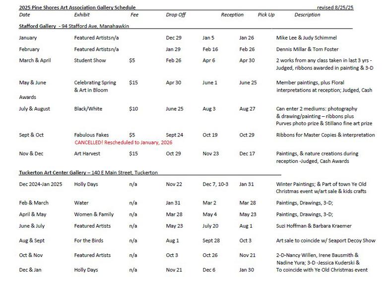 Pine Shores Art Association 2025 Gallery Schedule