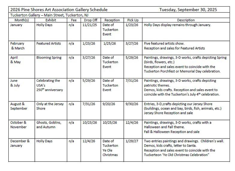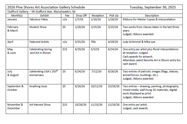 Pine Shores Art Association 2026 Gallery Schedule
