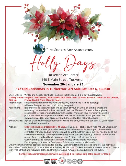 ​2023 HOLLY Days - Our ninth annual holiday-themed art show was in-studio this year in the Tuckerton gallery. Click the title to see the wonderful online entries of holiday and winter scenes. There was no fee, no judging.