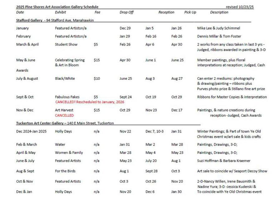 Here is the revised 2025 Gallery Schedule with adjustments for cancellation of the Art Harvest Show at Stafford and revised drop off and hang dates for the current Featured Artist and Holly Days Shows at Tuckerton.
