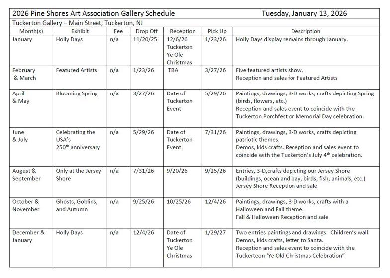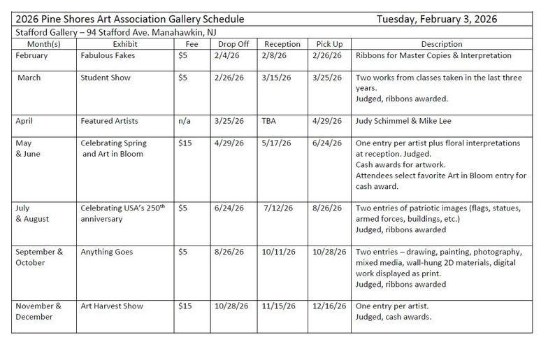 The Pine Shores Art Association's Stafford and Tuckerton buildings are barrier-free facilities with designated accessible parking areas, ramps with curb cut-outs, and complete wheelchair access. Both locations also feature wheelchair-accessible restrooms.